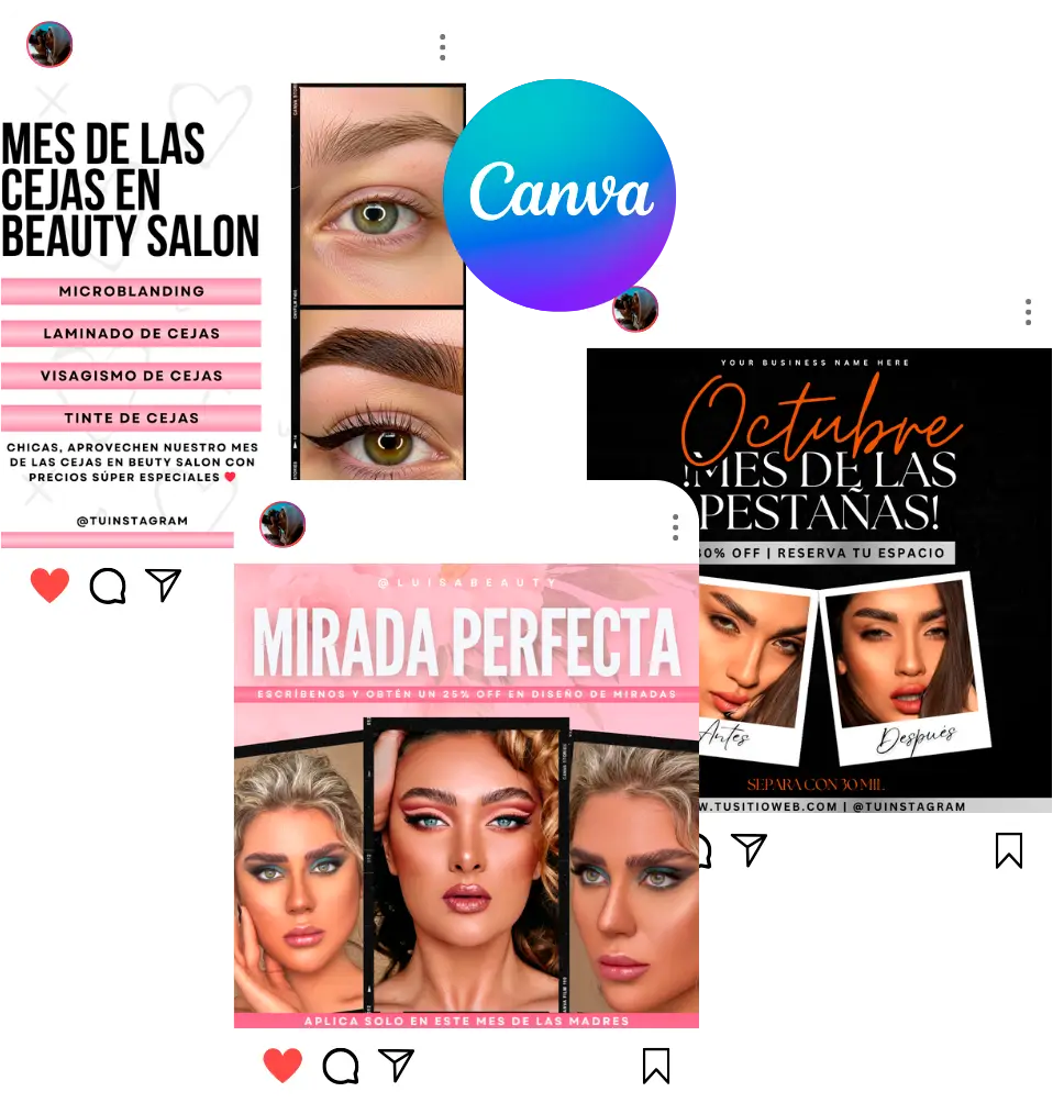 Dentro del combo hay plantillas para todo tipo de contenido que necesitas para tu negocio. Agendamiento, promociones y descuentos especiales, presentación de equipo, nuevos servicios, resultados antes y después, portafolio de servicios, tips rápidos, recomendaciones de productos, testimonios de clientes, eventos especiales y más. Las posibilidades de contenido que puedes crear son infinitas, estoy segura que te encantarán.